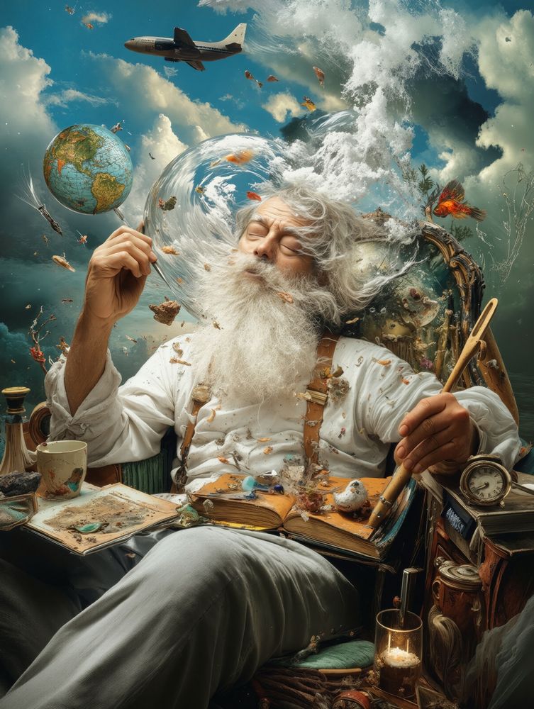 Step into a dreamlike world with *Heaven’s Broken Path*, a striking wall art print that blends imagination and emotion. An older man with silver hair and a long beard drifts in a scene suspended between reality and fantasy — surrounded by swirling winds, fragments of earth, a globe, an airplane above, and delicate natural elements caught mid-motion. The visual tension of this composition draws your eyes deeper: is it a journey, a collapse, or a transcendence?