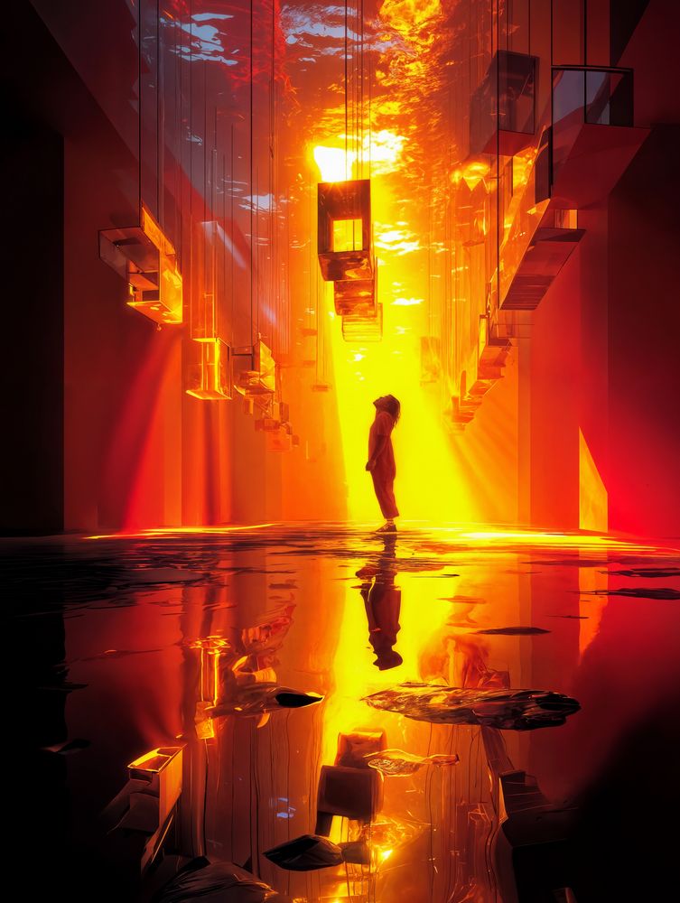 "Drive into the Abstract" is a bold and mesmerizing artwork that captures the mystery of light, reflection, and form. At its center stands a solitary figure, surrounded by a glowing cascade of fiery orange and golden tones. The surreal setting of floating structures and mirrored water creates a sense of otherworldly calm mixed with dramatic energy.