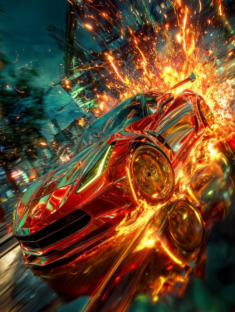 This artwork is perfect for those who live for energy and excitement. The metallic red body gleams like molten steel, while fiery yellows and oranges explode around it, creating an almost cinematic feel. It’s not just a car—it’s motion, heat, and velocity frozen in a single frame. Every glance makes your pulse race faster.