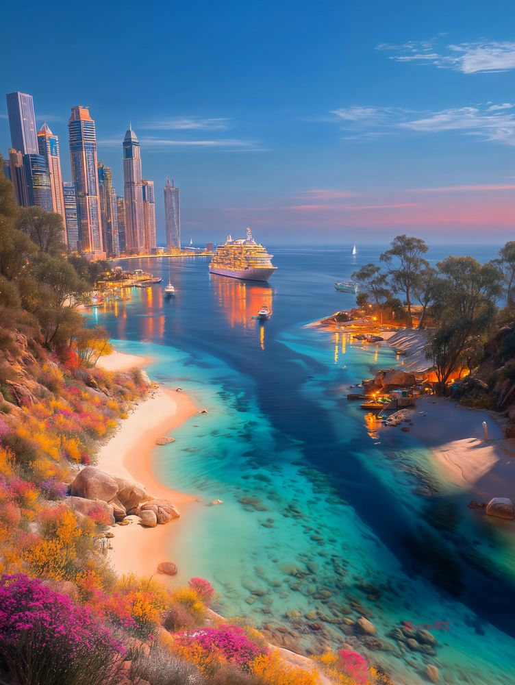 The mega yacht gliding gently across the horizon hints at luxury, adventure, and maybe a little wanderlust, while the modern skyline in the distance keeps things grounded, urban-chic, and ready-for-the-Gram. You can almost feel the evening breeze as it softens the colors, mixing golden city lights with pastel pinks and blues in the sky.