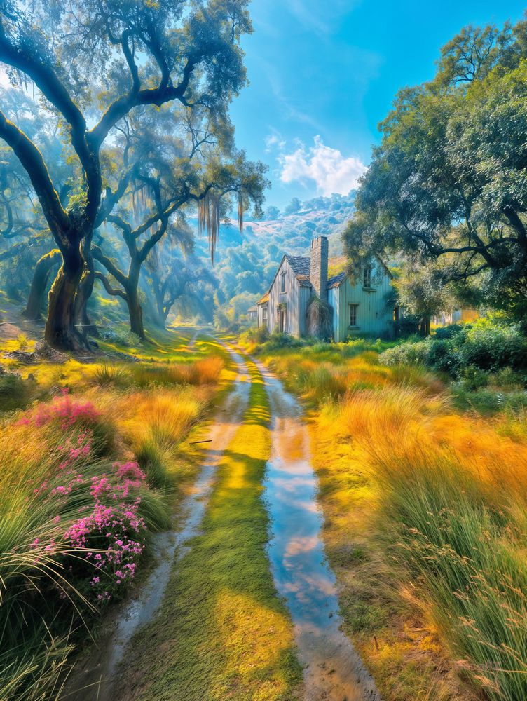 "Chasing Quiet" is like stepping into a dream of stillness. This art print captures a sun-drenched country path winding toward an old cottage, nestled among oak trees and rolling hills. Bright golden grass, pink wildflowers, and reflections in the puddles create a calming yet vibrant mood that fills your space with warmth and nostalgia.