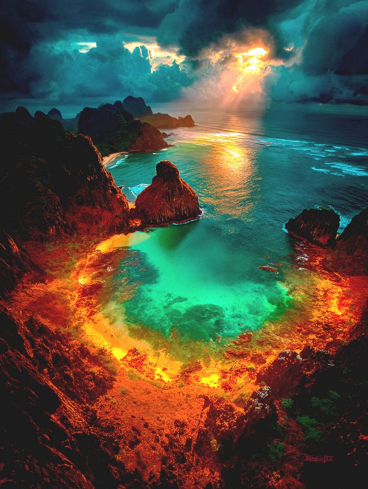 "Eclipse Lagoon" is an art print that captures one of nature’s most breathtaking moments—a secluded turquoise lagoon surrounded by fiery, sunlit cliffs, under a dramatic storm-filled sky. A break in the clouds sends a golden beam of light down onto the water, turning the scene into something almost otherworldly. This is not just a landscape—it’s a moment of pure magic frozen in time.