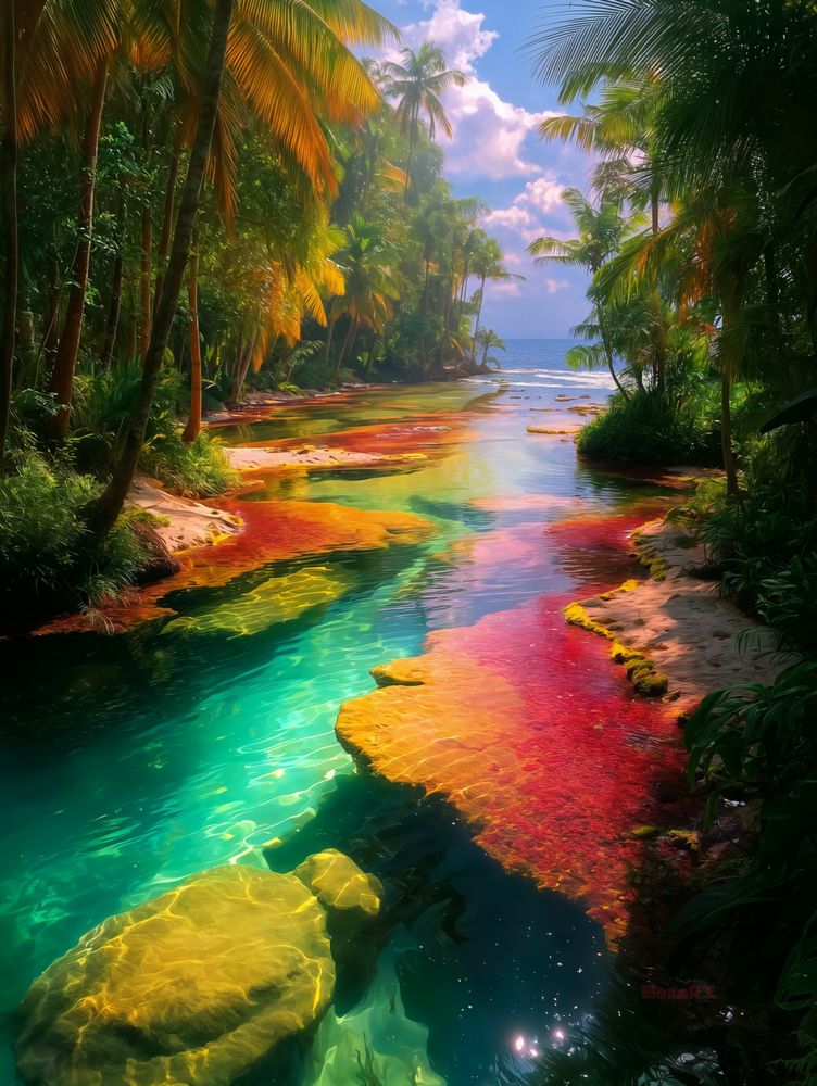 “Edge of Infinity” is a breathtaking art print that feels like stepping into a dream. A crystal-clear tropical river winds toward the ocean, its waters shifting from emerald green to deep turquoise, kissed by golden sunlight. Vibrant patches of crimson and amber shimmer beneath the surface, creating a surreal rainbow effect that looks almost too magical to be real.