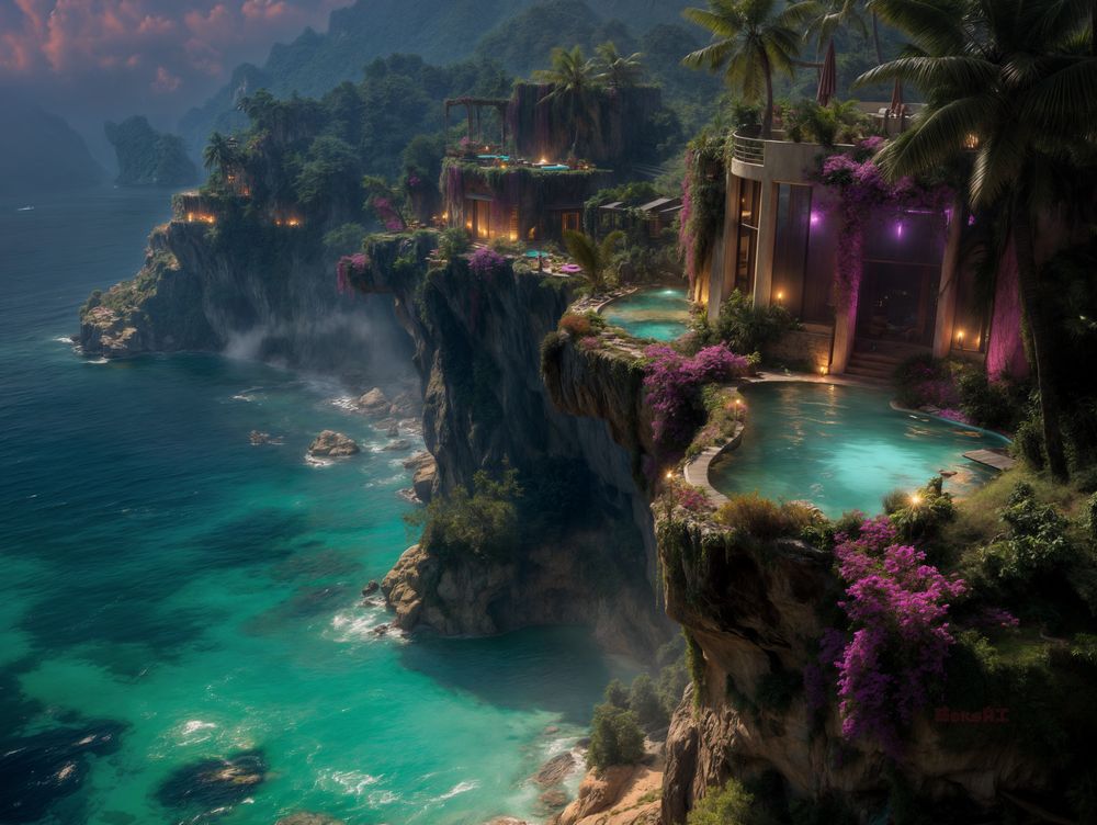 "Paradise Aglow" is a breathtaking view of a tropical cliffside resort, bathed in the warm radiance of golden lights and framed by vivid magenta flowers. Perched high above crystal-clear turquoise waters, the infinity pools seem to spill right into the ocean below, blending nature’s raw beauty with luxurious elegance. This is the kind of view that makes you want to pause time and just breathe it all in.