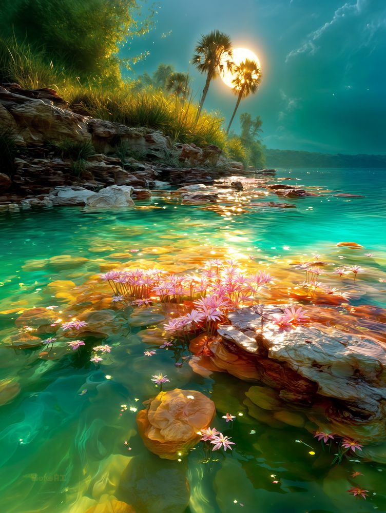 The palette? Imagine soft jade waters, warm amber reflections, and clusters of pastel pink and lavender flowers drifting atop the surface. It’s a dream scene that feels like a secret lagoon you've just discovered—peaceful, enchanting, and beautifully serene.