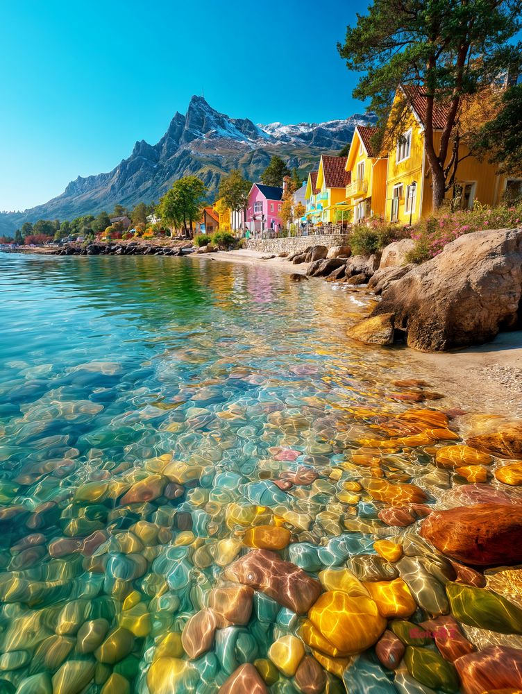 "Twilight Cove" captures a breathtaking coastal village bathed in vibrant light. The crystal-clear water reveals smooth, multicolored stones beneath the surface, glowing under the golden rays of the sun. Along the shore, cheerful houses in shades of yellow, pink, and turquoise stand against a backdrop of majestic mountains, creating a scene that feels both peaceful and full of life.