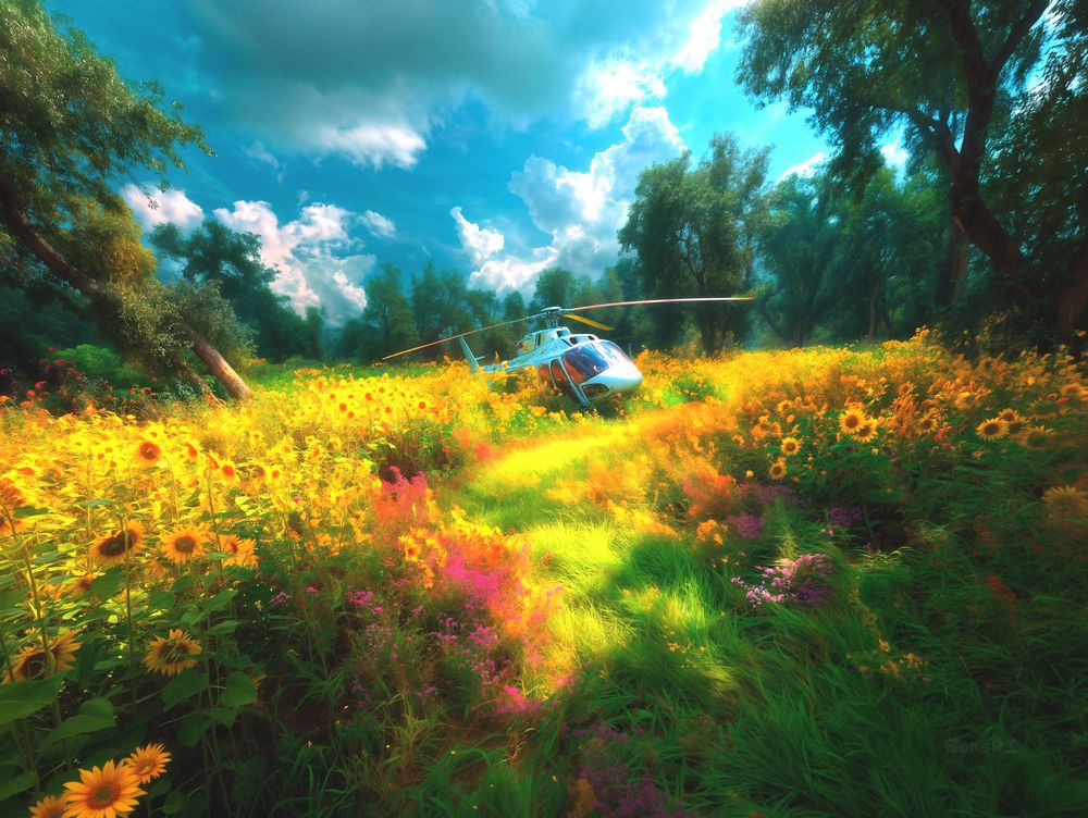 Perfect for those who appreciate the contrast of technology and nature, “Sunflowers and Steel” embodies freedom, exploration, and the beauty of wild landscapes. The bright sunflowers symbolize positivity, while the helicopter hints at adventure, offering a balance of peace and thrill.