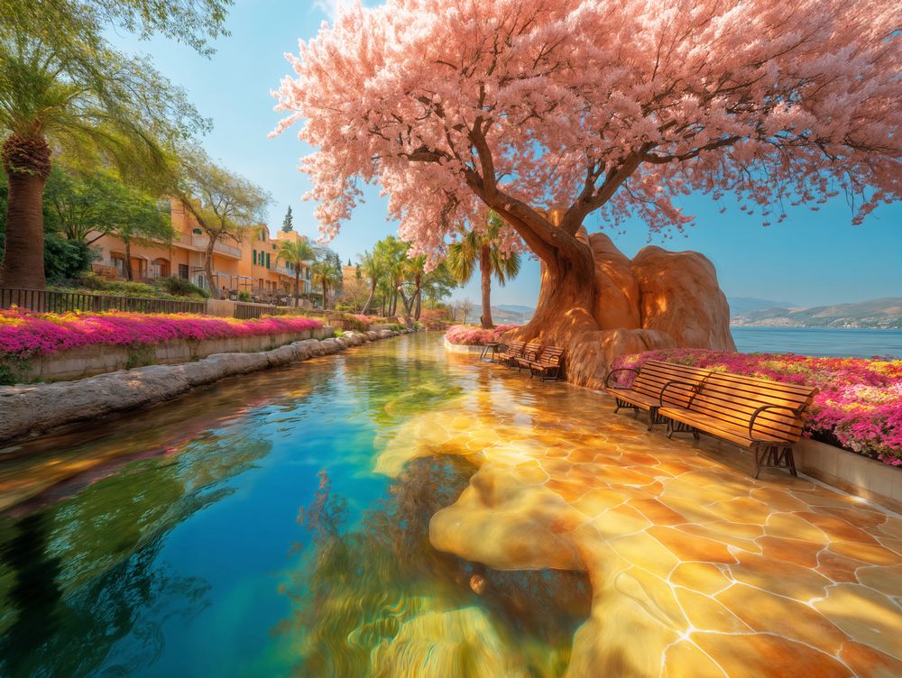 Imagine sitting on a quiet bench under the canopy of a breathtaking pink blossom tree, the sun dancing off golden tiles beneath your feet, and a crystal-clear stream reflecting the calm sky. That’s the story “The Blooming Shore” tells. This enchanting art print captures a peaceful coastal walkway, lined with blooming flowers and gentle water, all beneath the watchful beauty of springtime in full bloom.