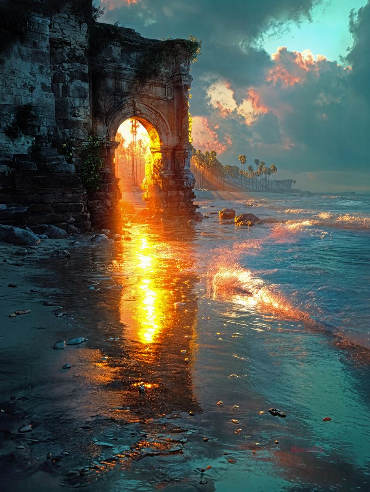 This artwork transports you to a mysterious coastal world where ruins stand resilient against the tide, and every sunset feels like the doorway to another realm. The composition draws your eye straight through the arch and into the radiant horizon, filling your space with a sense of wonder and timeless beauty.