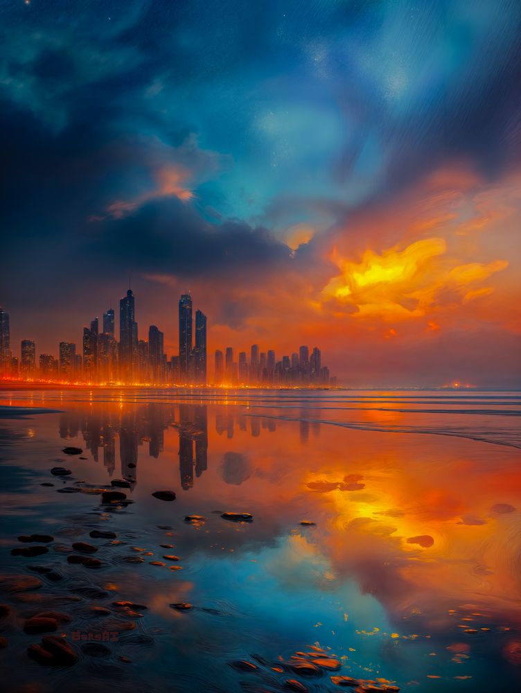 This stunning print captures that magical moment when two realities seem to meet — the glowing city of the future and the tranquil reflection of a fantasy sunset. "The Glow Between Worlds" features a modern skyline lit with warm orange tones, mirrored on a calm shore that’s painted in vibrant blues, purples, and golds. It’s not just an image — it’s an experience.