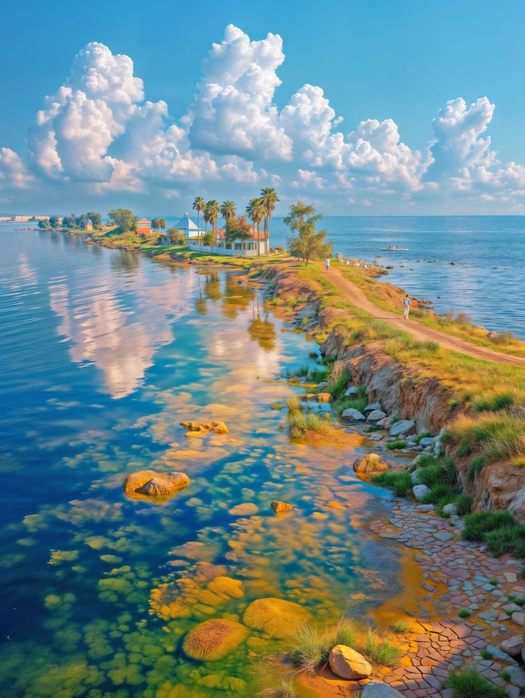 “The Last Curve of Land” is like a deep breath of coastal calm. This art print captures a serene moment along a winding shoreline, where golden rocks rest in shallow water, and fluffy clouds stretch endlessly across a peaceful blue sky. A narrow path leads your eye down the coast, inviting you to wander — even if only in your imagination.