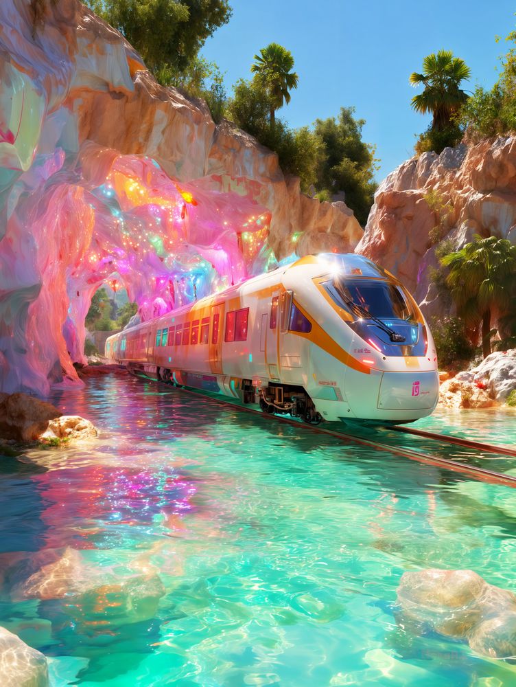 There’s something electric about this artwork. The colors shimmer — hot pinks, glowing purples, dreamy teals — all dancing on the water's surface and across the train’s sleek exterior. It feels futuristic yet peaceful, like something out of a storybook, or a perfect dream.