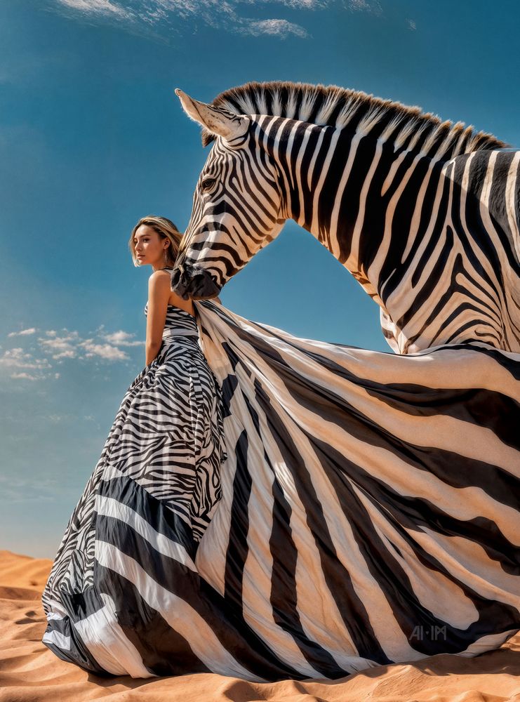 Daughter of Zebra is a breathtaking art print that fuses fashion, nature, and imagination into one stunning image. The artwork features a graceful woman in a flowing zebra-patterned gown that seamlessly blends into the stripes of a majestic zebra. Set against golden desert sands and a bright blue sky, this print captures both strength and harmony between humans and the wild.