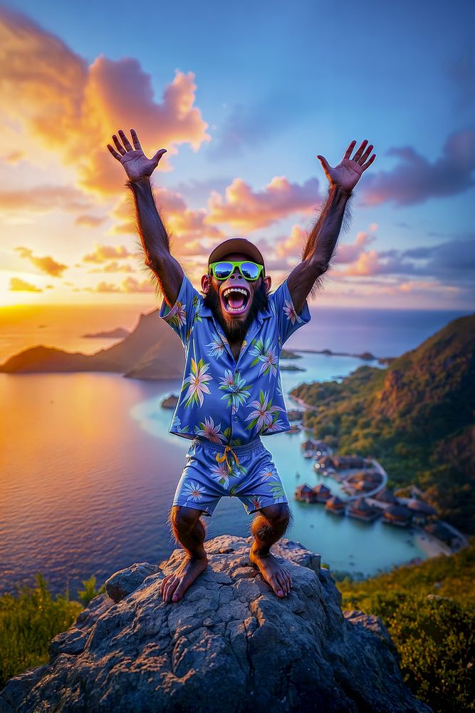 “Sandy Toes & Sunset Glows” is a vibrant art print that radiates pure fun and carefree energy. It features a cheerful monkey dressed in a tropical floral outfit, throwing its arms up in excitement while standing on a cliff with a stunning island sunset in the background. This artwork captures the ultimate vacation vibe—playful, colorful, and full of life.