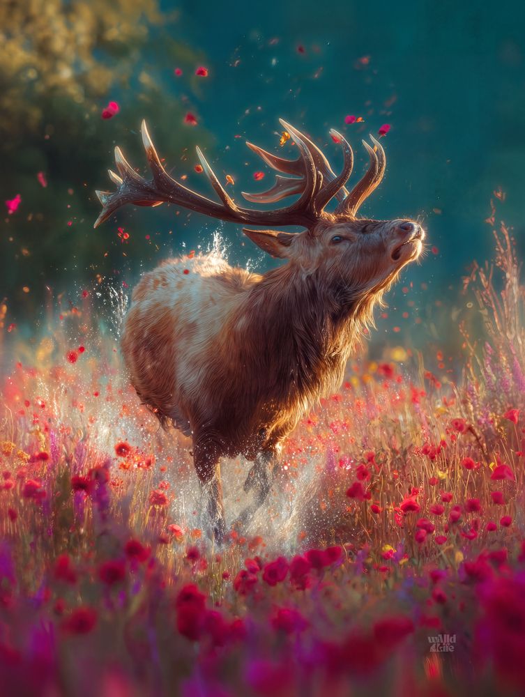 This print captures a majestic elk bursting through a poppy-strewn meadow in full motion, antlers raised high, energy and life in every droplet of water splashing around its hooves. The colors are vivid: warm golds and amber fur, contrasted by deep forest greens in the background, soft sunlit glows, and bold pops of red from wildflowers dancing in the breeze. It feels like a moment suspended—wild, free, yet intimate.