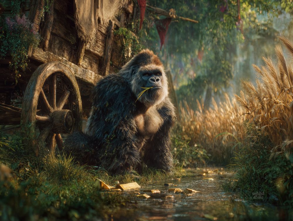 Picture this: a magnificent silverback gorilla, strong and silent, standing near a rustic wooden cart, beside a gentle stream, surrounded by golden grasses and warm sunlight filtering through thick foliage. The mood is tranquil yet powerful – you sense quiet majesty, raw nature, and the serene beauty of a creature at ease in its element.