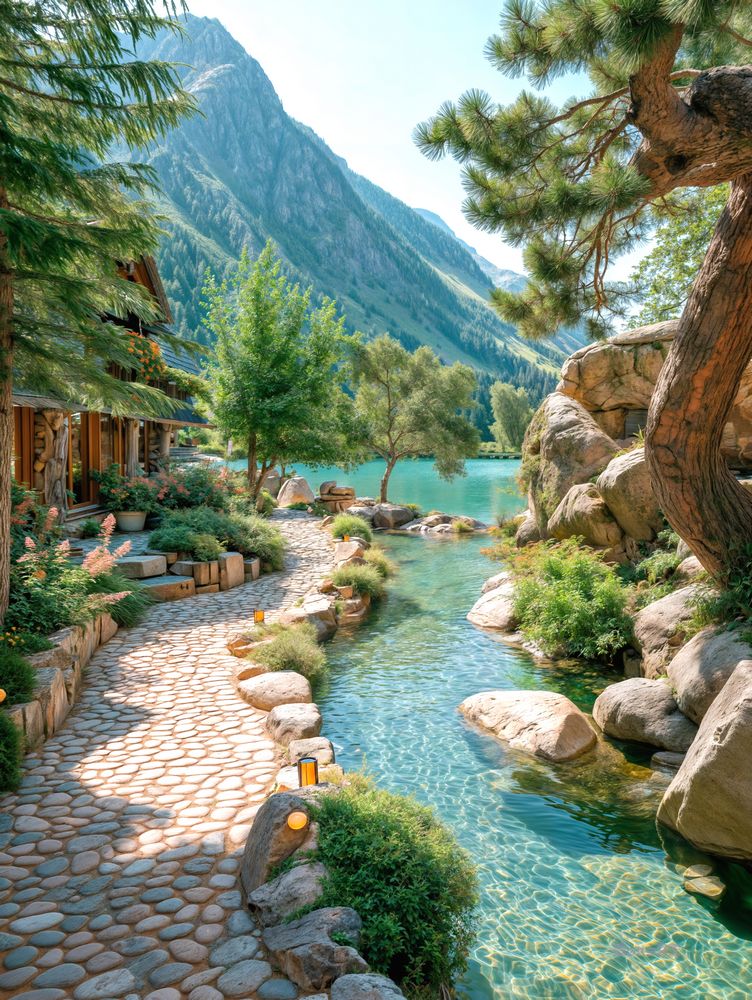 “Cradle of the Hills” is a stunning high-resolution art print that captures a serene mountain retreat where stone paths wind along crystal-clear water and pine trees reach toward the sky. The scene is quiet, lush, and peaceful — perfect for bringing natural calm into your home. The soft lighting, warm stone textures, and vibrant greenery create a sense of safety and stillness that feels like a deep breath for your walls.