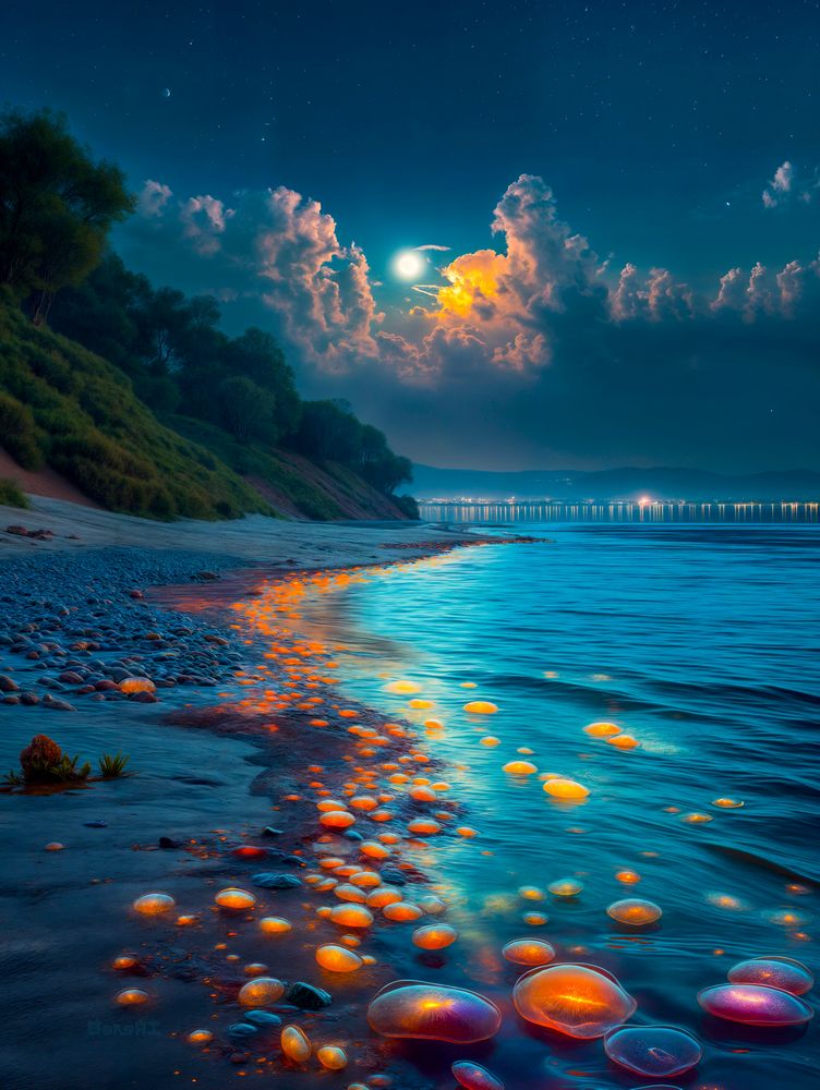 Whether you’re a lover of fantasy art, beachscapes, or celestial themes, this print speaks to your soul. The glowing orbs scattered along the shoreline feel otherworldly—like nature’s own fairy lights. It’s more than a decorative piece; it’s an invitation to wonder.