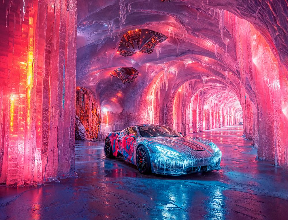 Step into “Frozen Velocity,” where a sleek sports car, draped in icy frost, rests in a glowing tunnel of crystalline ice and neon light. The vibrant pink and blue hues contrast sharply against frozen stalactites—creating a scene that’s both futuristic and dreamlike. It feels like adrenaline paused mid-shift, wrapped in a winter wonderland.