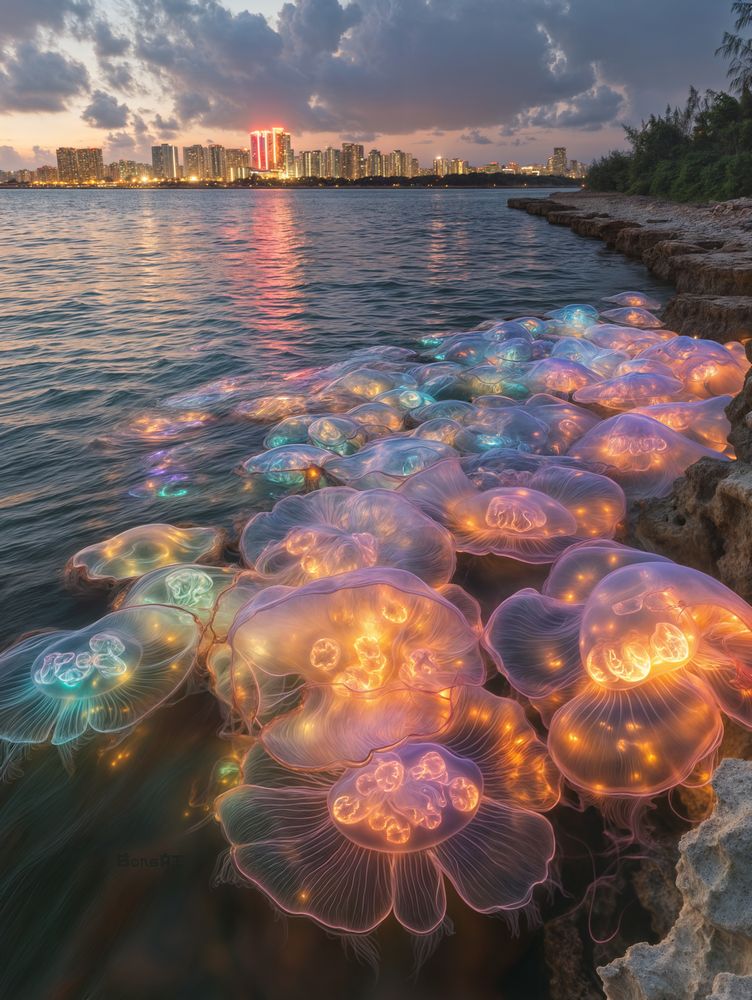 This piece brings a feeling of peace mixed with awe. The jellyfish aren’t just visually striking—they seem to pulse with life. Their bioluminescent glow adds a dreamy, almost sci-fi touch to an otherwise familiar coastal setting. It’s a stunning blend of realism and fantasy, making this print a conversation piece for any space.