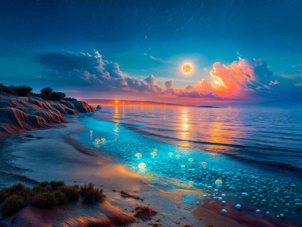 Step into a surreal world where the ocean glows and the sky dances with fiery colors. "Glow in the Dusk" captures a breathtaking moment just after sunset, where golden and pink clouds drift across a deep blue sky, and a glowing full moon rises above the calm sea. Jellyfish gently float near the shore, illuminated by the soft shimmer of moonlight reflected on the water.
