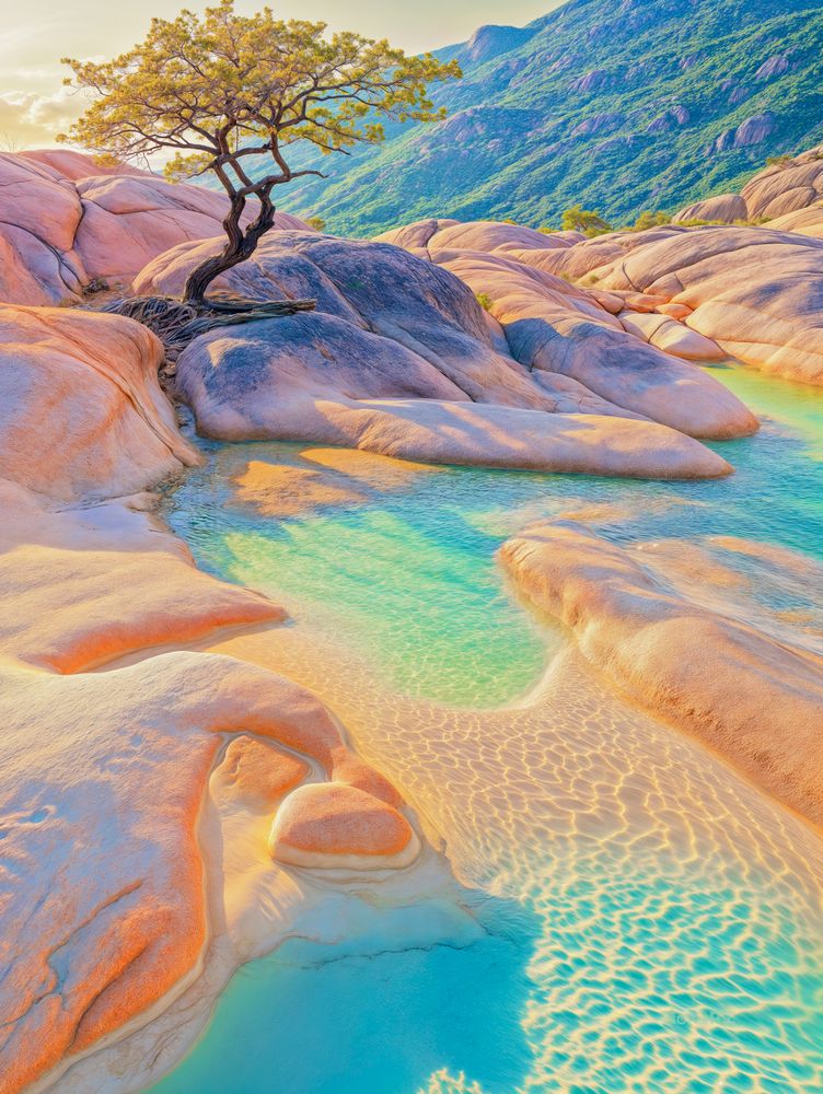 This stunning art print, titled "Nature's Palette", captures the surreal beauty of a crystal-clear lagoon surrounded by soft pastel rocks and a single resilient tree. The golden sunlight gently highlights the textures of the stones, while the turquoise water glows with dreamlike clarity. It’s the perfect piece for anyone who loves serene landscapes and wants to bring a calming yet inspiring atmosphere into their space.