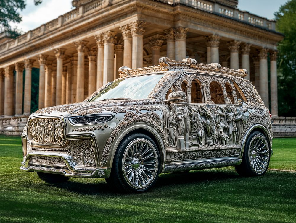 “Old Gods, New Roads” is a striking art print that blends the elegance of ancient craftsmanship with the sleek lines of modern engineering. A luxury SUV is transformed into a moving masterpiece, adorned with intricate stone-like carvings of classical gods, goddesses, and mythological scenes. Set against the backdrop of grand Greco-Roman architecture, this image captures a surreal meeting of history and the present day.