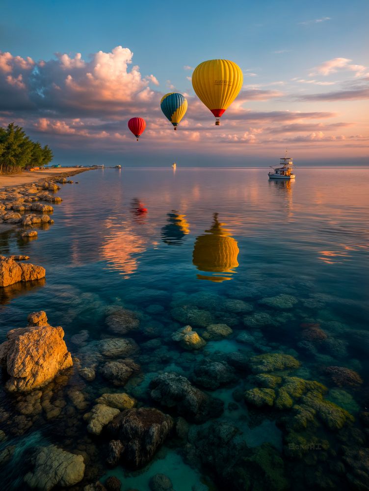 “Over the Crystal Shore” captures a breathtaking moment where vibrant hot air balloons float peacefully over clear turquoise waters. The warm light of sunrise bathes everything in soft gold and pink hues, while rocky coral formations beneath the surface create depth and texture. This art print blends serenity with adventure—perfect for dreamers and travelers at heart.