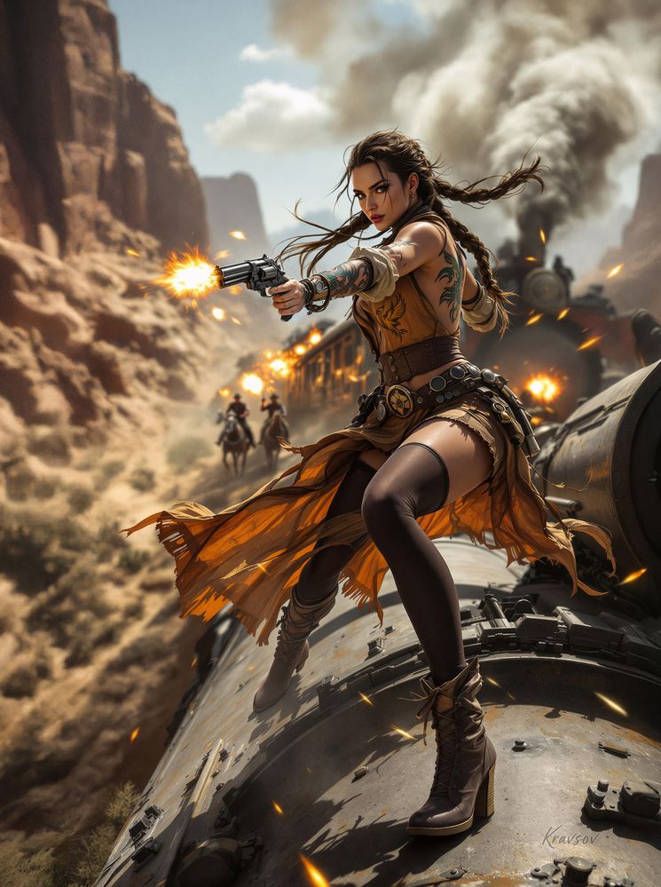Rebel on the Rails is ideal for anyone who lives a little wild and loves stories of bold outlaws and untamed frontiers. The heroine’s confident stance, flowing outfit, and sleeve tattoos add an extra layer of personality and attitude — she’s not just a fighter, she’s a symbol of resistance.