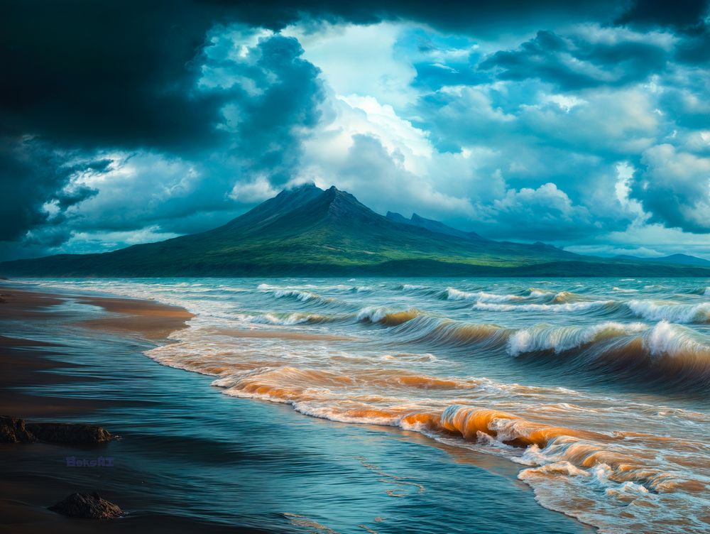 "Shadows and Waves" captures the raw beauty of nature in motion. A moody ocean crashes onto a golden shoreline while storm clouds swirl above a majestic mountain. The contrast between light and shadow, calm and chaos, makes this piece truly unforgettable.