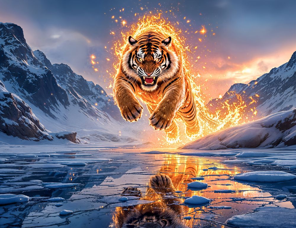 This artwork is all about bold vibes. It’s not just a picture of a tiger — it’s a roaring force of nature, lit from within by golden fire, as it charges across a frozen lake. Whether you’re chasing your goals or just want something fierce on your wall, this print is made to inspire and energize.
