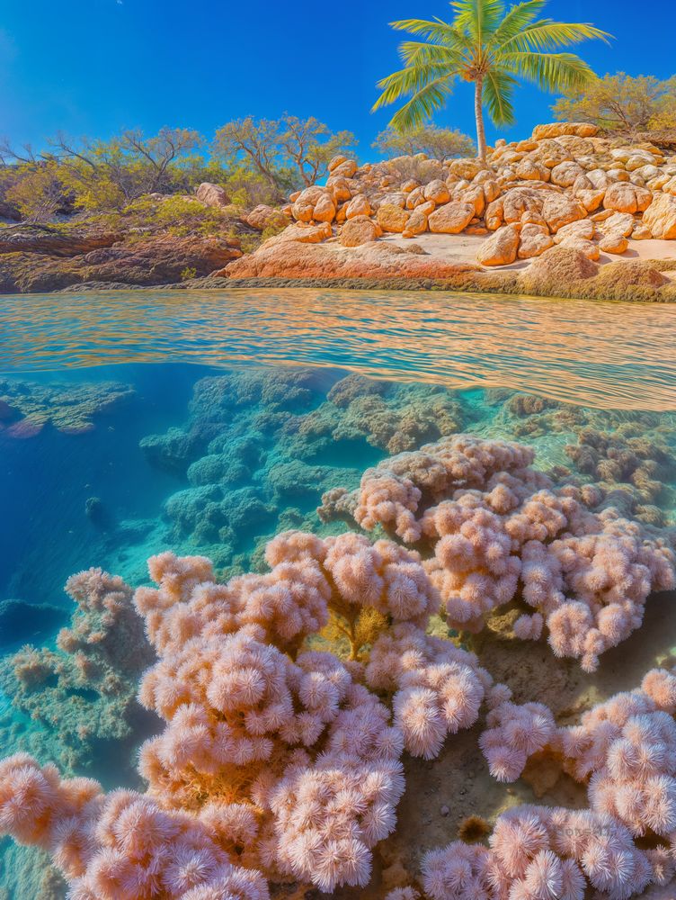 This artwork is a perfect match for anyone who dreams of distant shores and hidden paradises. Whether you're decorating your coastal-themed home, office, or studio, this print brings a serene escape to your space. The light pink corals under the surface and golden stone textures above ground evoke an ethereal duality — it’s like you’re looking at two worlds in one frame.